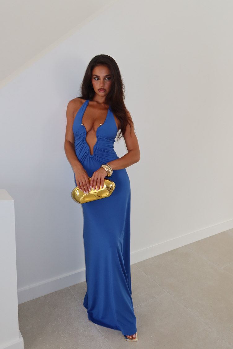 Halter U Ruched Neck Cut Out Jersey Dress in Blue