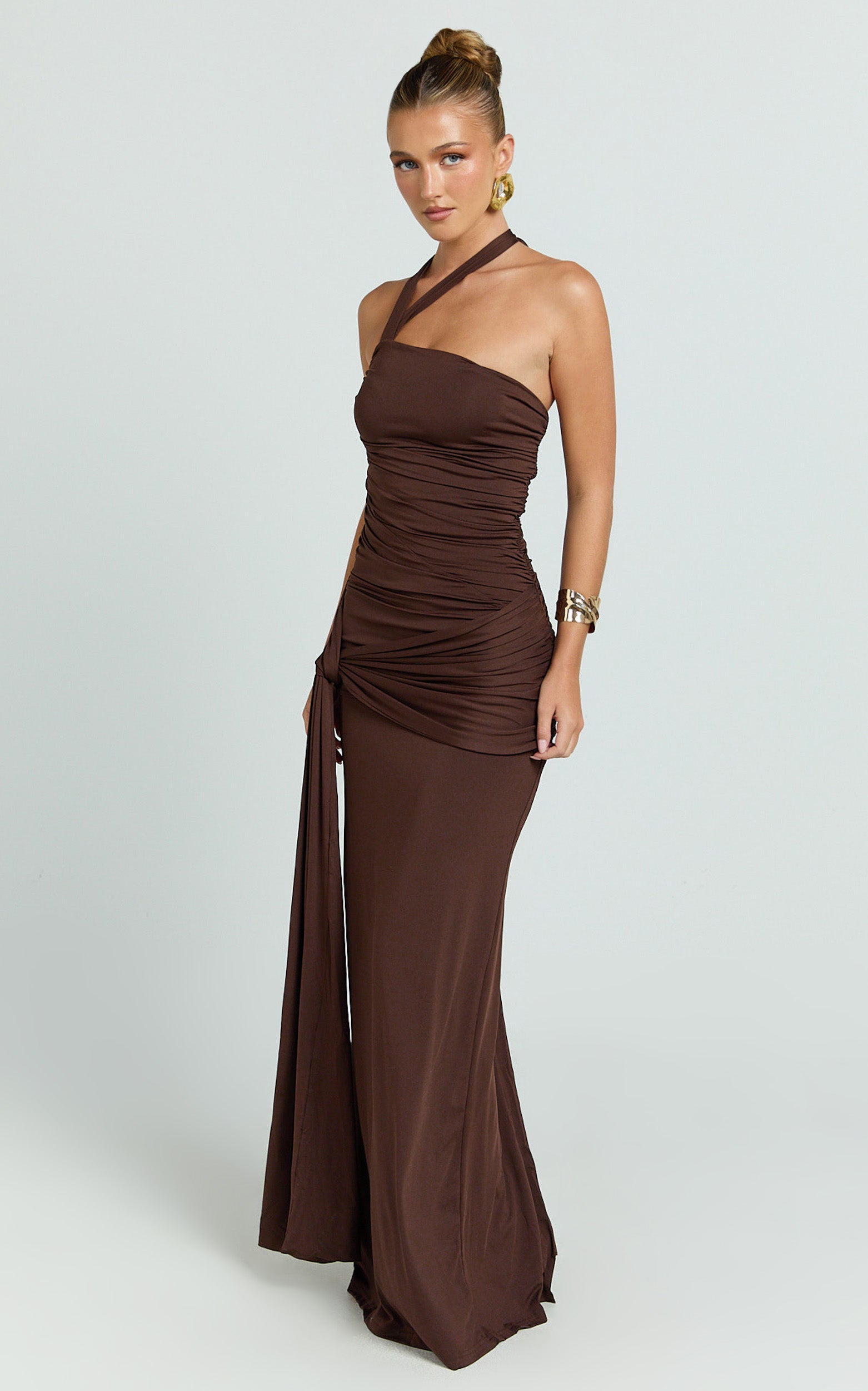 Asymmetric Neck Waist Tie Dress in Chocolate